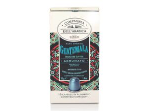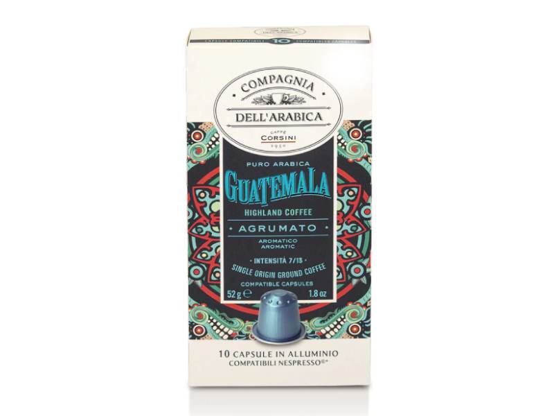 Corsini-ს ყავის კაფსულები Compagna D’ell Arabica Guatemala – 100% არაბიკა, ციტრუსის და შოკოლადის ნოტებით. გუატემალაში ყავა მოჰყავთ 850-დან 3,700 მეტრამდე სიმაღლეზე, სადაც უნიკალური ეკოსისტემებია – სუბტროპიკული ტყეებიდან წიწვოვან ტყეებამდე.