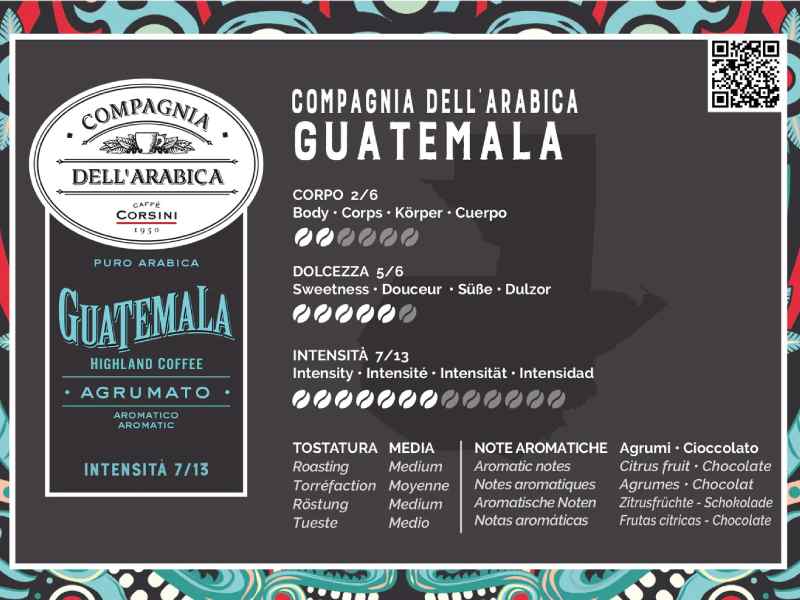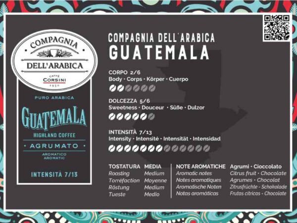 ქვეყნის თითოეული რეგიონი გამოირჩევა უნიკალური მორფოლოგიითა და მიკროკლიმატით, რაც გავლენას ახდენს ყავის გემოსა და არომატზე. სწორედ ასეთია Corsini Guatemala კაფსულა, გამოირჩევა სრულყოფილი სხეულით და სასიამოვნო მჟავიანობით. დაბალანსებული და არომატული ყავა აგავსებთ ენერგიით, ყვავილების, ციტრუსისა და შოკოლადის ელფერებით.