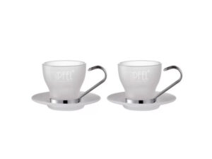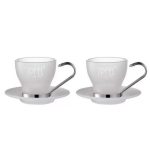 ეს ელეგანტური ჭურჭელი დაამშვენებს ნებისმიერ მაგიდას. 2 ცალი 105 მლ მოცულობის ჭიქის ნაკრები. დამზადებულია ხარისხიანი მინისგან. ქრომირებული ყურები ლითონის ბრწყინვალებით. გარე ზედაპირზე დეკორაციად გამოიყენება მწარმოებლის ბრენდის სახელწოდება. თეფშები დამზადებულია იგივე მასალისგან.