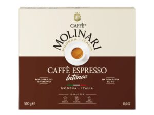 Caffè Molinari Espresso Intenso – 40% არაბიკის და 60% რობუსტას ბლენდი საშუალოზე მუქი მოხალვით ინტენსიური ესპრესოს მოყვარულებისთვის იდეალური არჩევანია. ძლიერი, სრულსხეულიანი ყავა კლასიკური იტალიური ხასიათით. გამოირჩევა სქელი და მდგრადი კრემათი, შავი შოკოლადისა და მოხალული მარცვლეულის ნოტებით და პრაქტიკულად ნულოვანი მჟავიანობით.